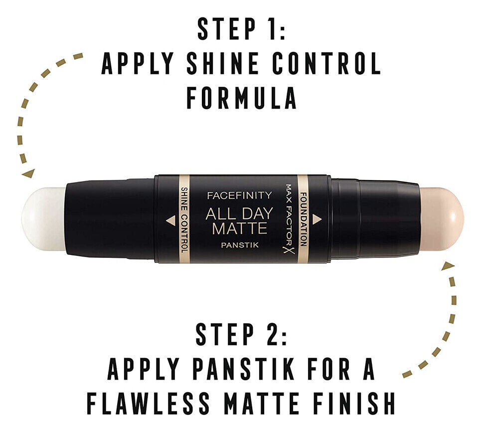 - Double ended stick featuring a foundation and a shine control formula